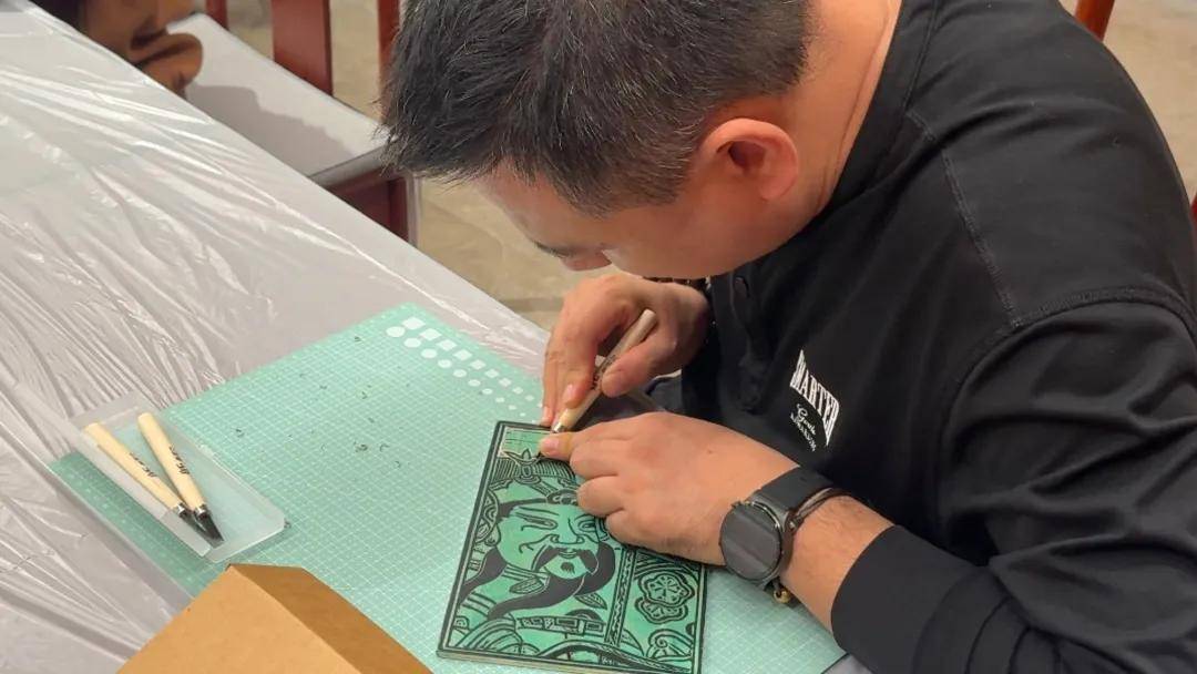 活动现场,体验者们在史彦青老师的悉心指导下,感受藏书票雕刻的独特魅力。大家在实操中细致观察门神线条特点,品味北京年画的古朴韵味;以刀为笔、以木为纸,或凝神静气,手眼合一,刻出利落直线;或双手协作,轻转木板,勾勒婉转曲线。
