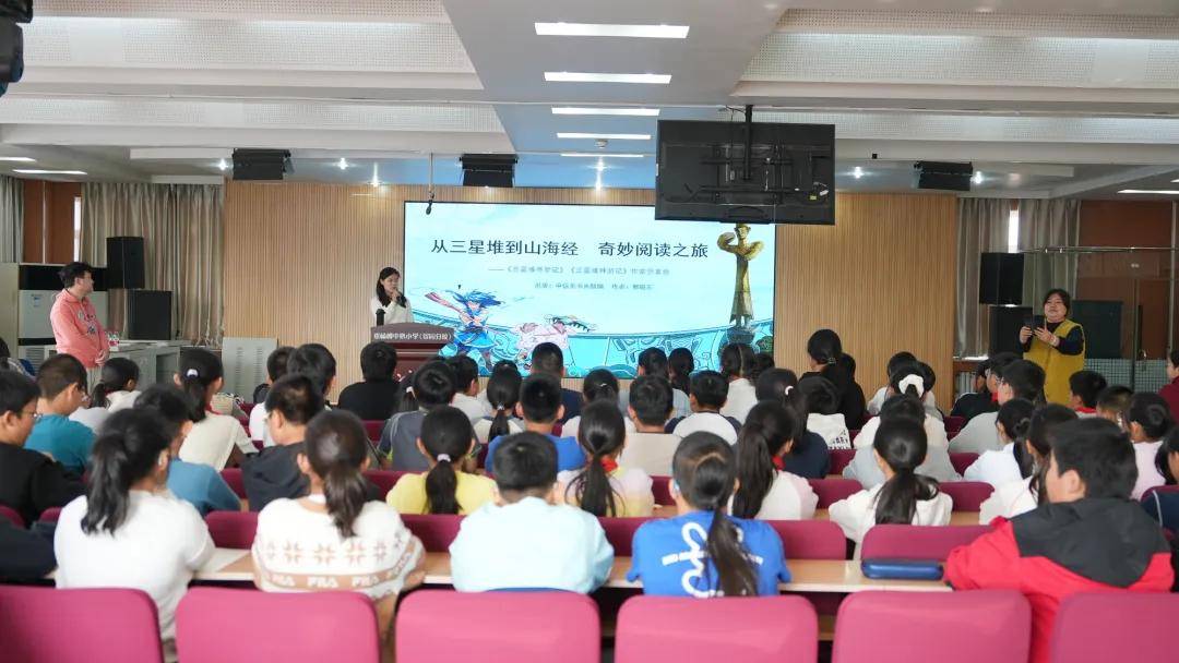 活动中,郭晓东老师以国宝三星堆青铜神树与《山海经》之间的联系为切入点,结合其创作的《三星堆寻梦记》、《三星堆神游记》系列图书,带领学生们开启了一场奇幻的中国神话之旅。