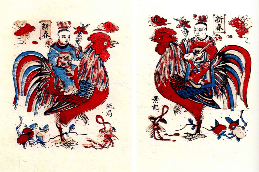 春鸡门神是中国民间最具特色的传统门神类型之一,以雄鸡为核心形象,承载着驱邪纳吉、报晓迎春的文化内涵,其历史可追溯至门神文化的源头阶段,比常见的武将门神更为古老。意为级上加官、四时加意、吉庆有余。亦有“一声叫醒读书子,五更唤起力田人”之意。