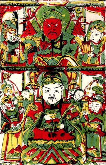 上层绘武财神关羽,下层绘文财神,巧妙运用谐音双关手法,将 关”与“官”对应,寄托了百姓对“升官” 与“发财”的双重美好祈愿,是传统民俗文化中仕途与财富梦想的直观表达。
