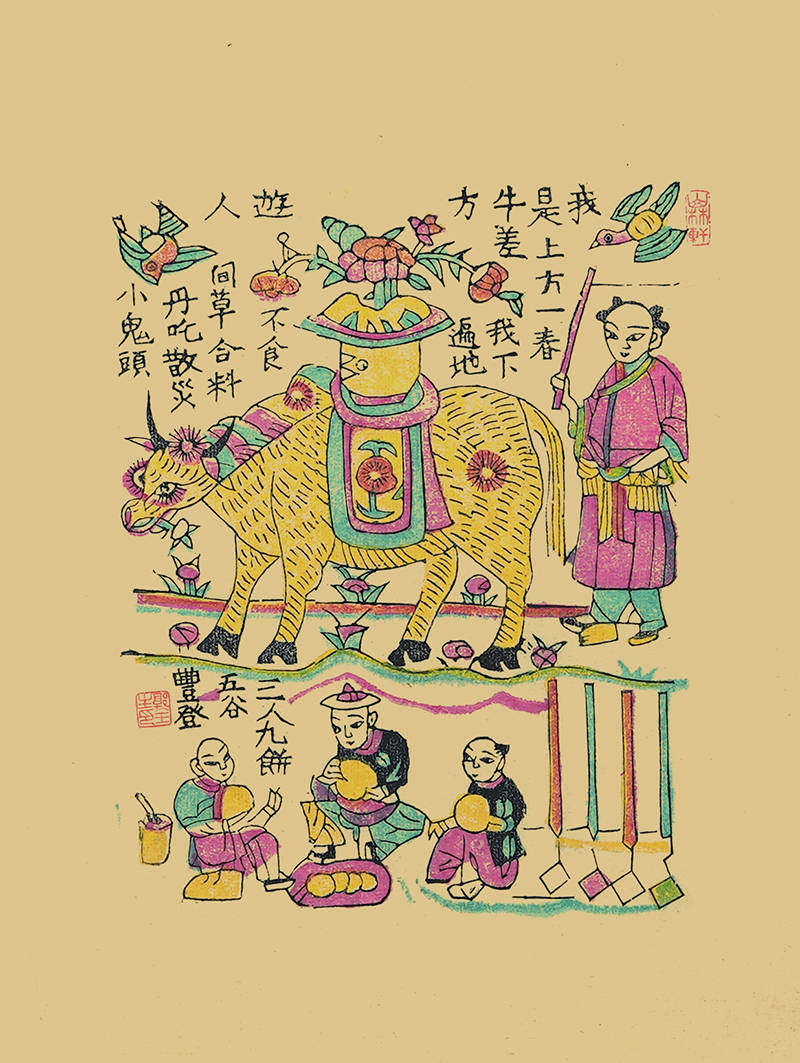 八是趣味类,像《老鼠娶亲》《猴子抢帽》《猫蝶富贵》等,画面充满童趣与生活情趣,同时寓意多子多福。其中,《春牛图》被《中国美术全集》收录,是新绛木版年画的经典之作,画面中春牛、芒神形象生动,寄托了农民对丰收的期盼。