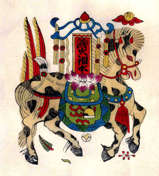 画面以憨态可掬却筋骨健壮的宝马良驹为核心意象,骏马身驮饱满福袋,袋面一朵莲花灼灼绽放,清雅灵动。福袋之上,“善火福水” 四字赫然醒目,意蕴深远:善火取灶火之象,既象征人间烟火的温暖炽烈,亦寓含以善念之火照亮生活、驱邪纳祥的祈愿;福水则喻指甘霖惠泽、财源充盈,承载着人们对风调雨顺、富足安康的向往。火暖水柔,二者相生相融,道尽百姓对和美日子的质朴期许。