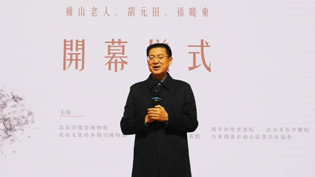 2025年11月1日,“方寸大道场”诗书画印三人展在北京崇德堂博物馆隆重开幕。中国民俗学会北京分会常务理事、国家一级演员、昆曲艺术家张卫东老师,为补山老人、胡元田、孙晓东三位艺术家的精彩联展主持开幕仪式。
