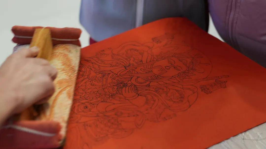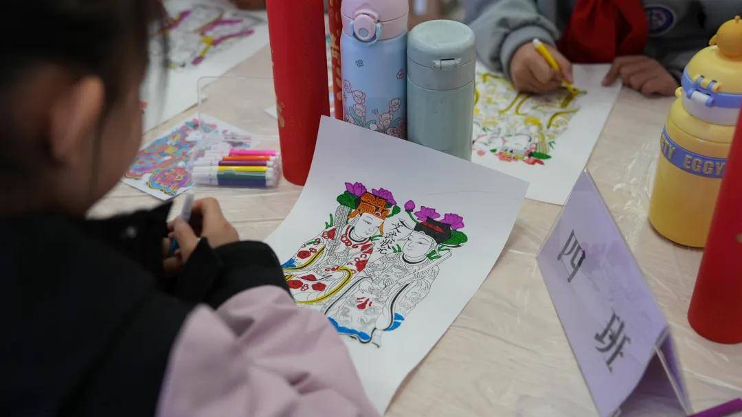 在年画上色实践中,同学们通过个人的创意色彩搭配,让年画增添青春光彩!依据年画分版套色的技法,同学们手持画笔,在线稿上大胆创作。有的遵循传统用色,让年画延续浓郁厚重的风格;有的则别出心裁,用明快的色彩搭配赋予年画新的面貌。在选色涂抹间,同学们深刻体会到非遗技艺的匠心所在。